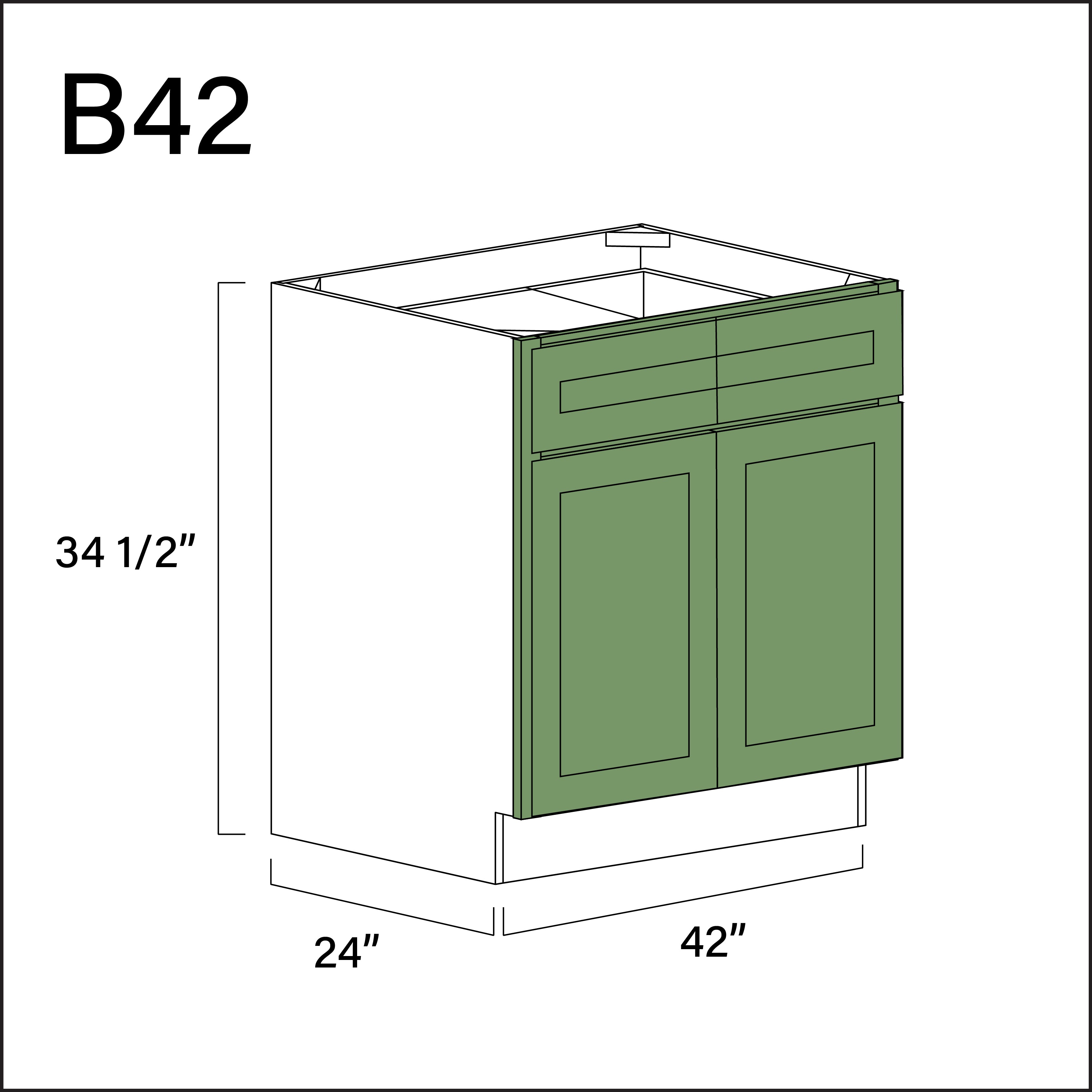 Emerald Green Shaker 2 Drawer 2 Door Kitchen Base Cabinet - 42" W x 34.5" H x 24" D